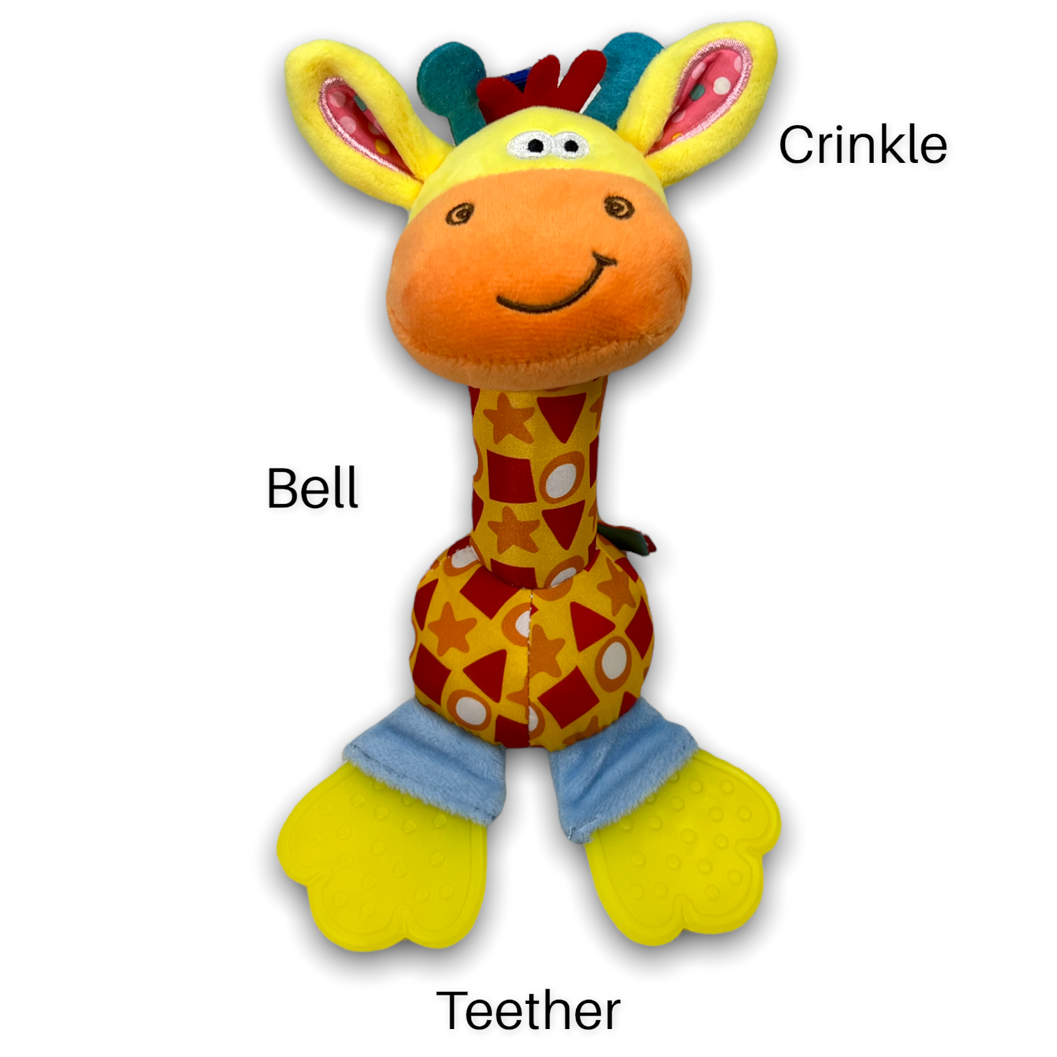 This collection of cute toys has multiple features which include a wind bell and a stimulation crinkle and squeak sound. There are also teethers to help engage with the curiosity of chewing while massaging delicate baby gums, all while being the perfect size for a suitable hand grasp!
