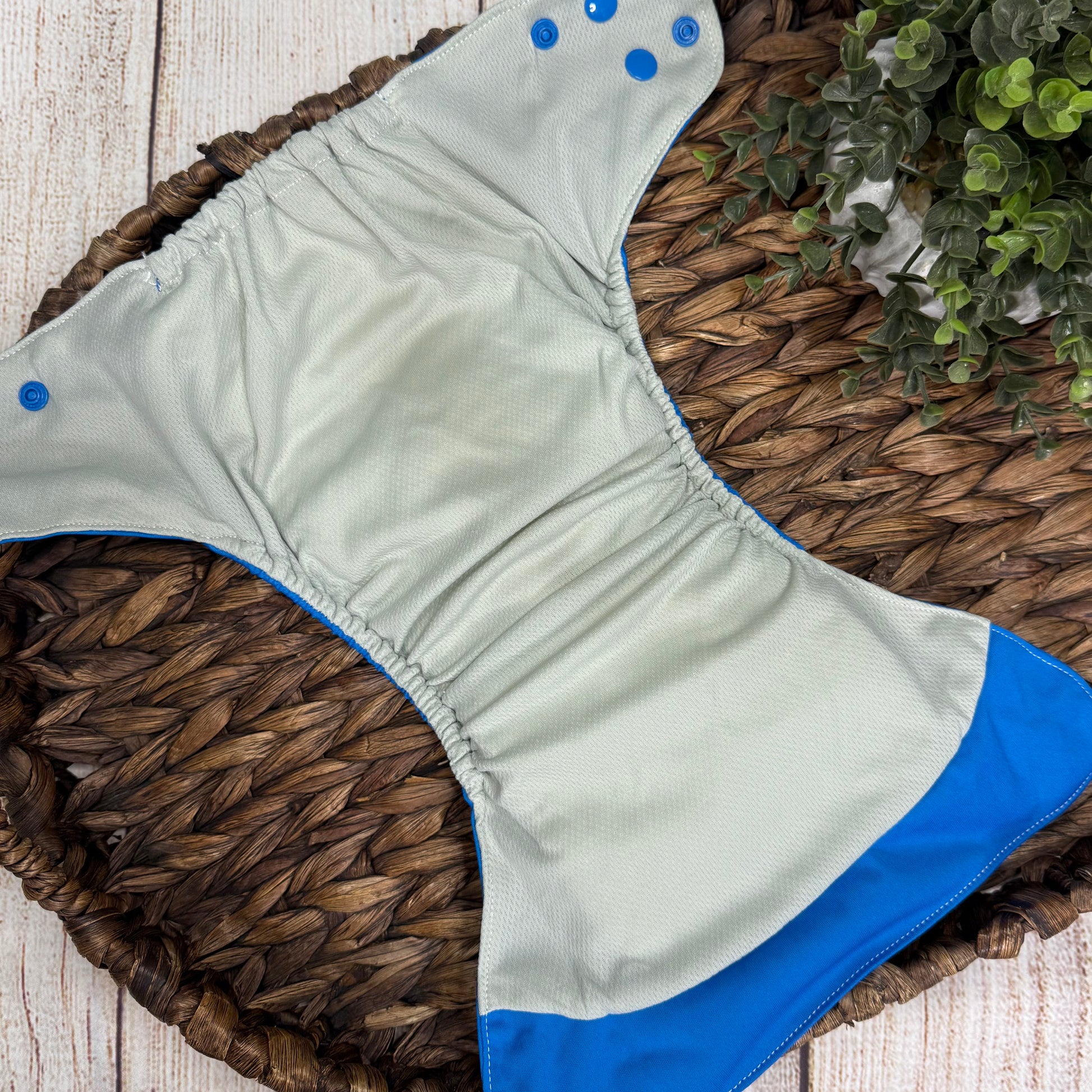 - Grey AWJ inner layer, PUL curved tummy panel to help prevent leaks, gentle back and leg elastics, and a pocket opening.