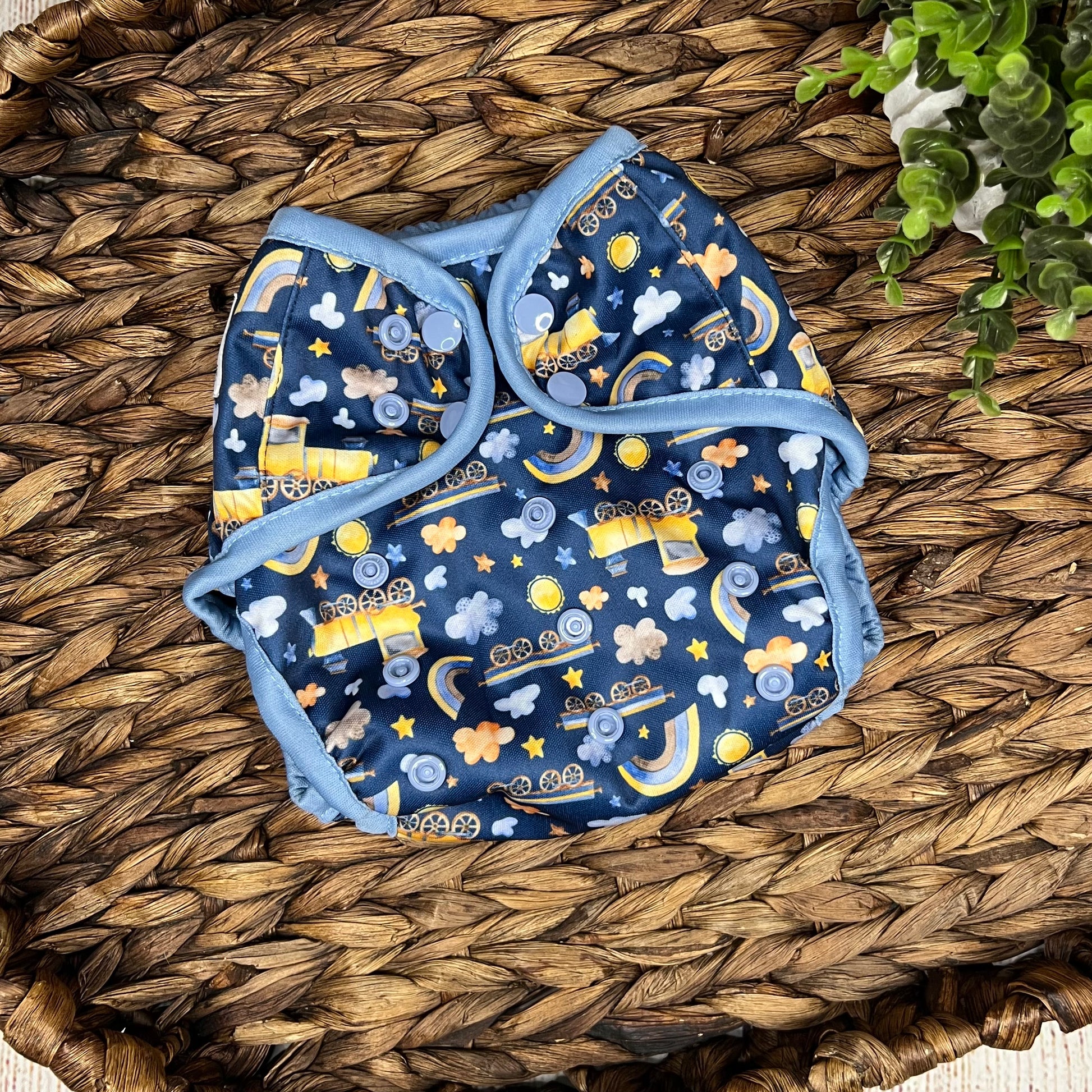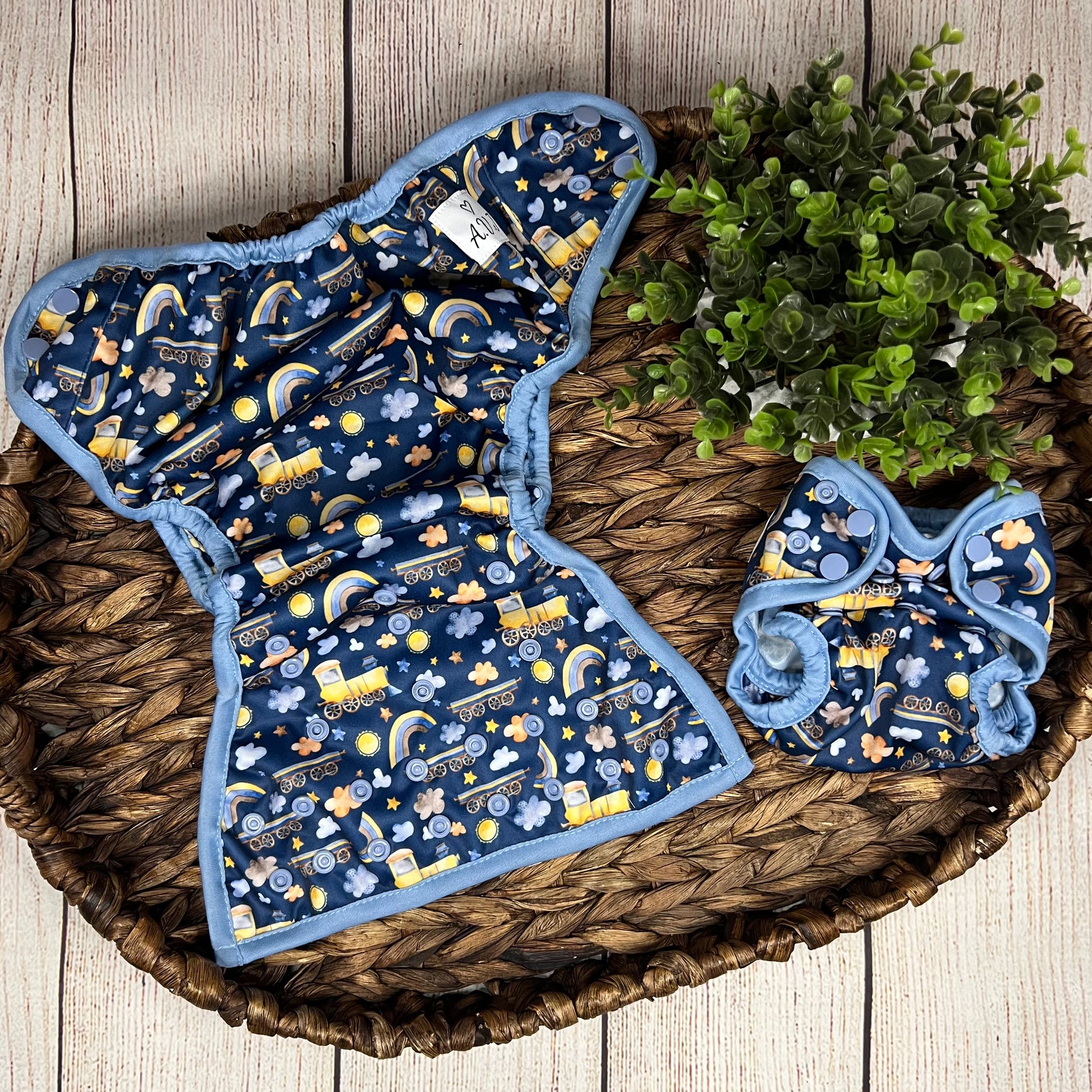Our diaper covers are available in One Size and Newborn. Both sizes are identical as far as features with the exception of a snap down option on the newborn size for the umbilical cord.