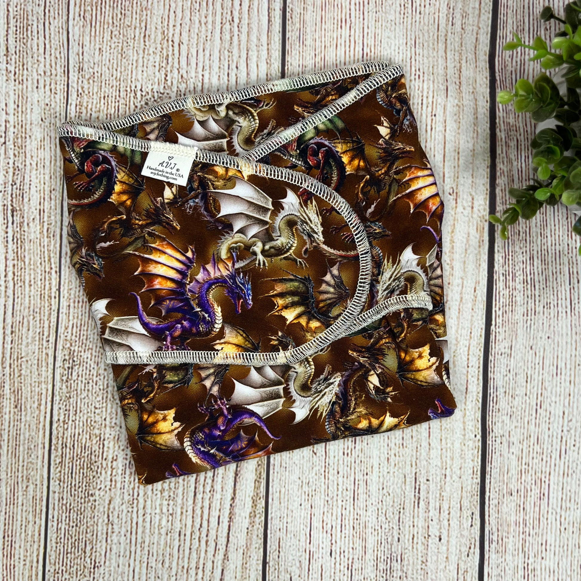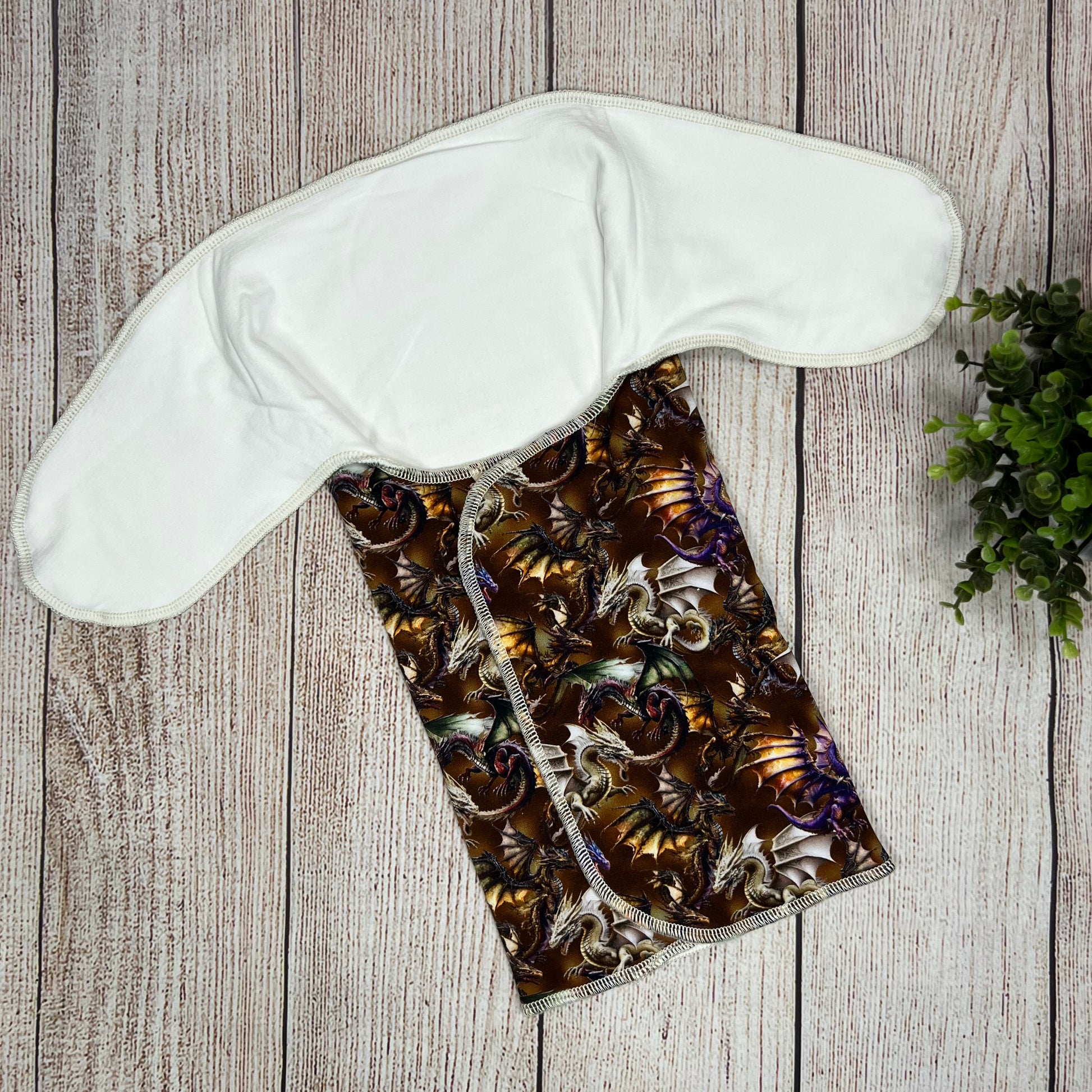 Preflats are an excellent choice for a perfectly trim fit diaper with all around coverage and high absorbency. Our preflats are handmade by me (Tara). They have a 4-way stretch for a better fit. This Dragon print is made of Bamboo/Spandex Jersey.