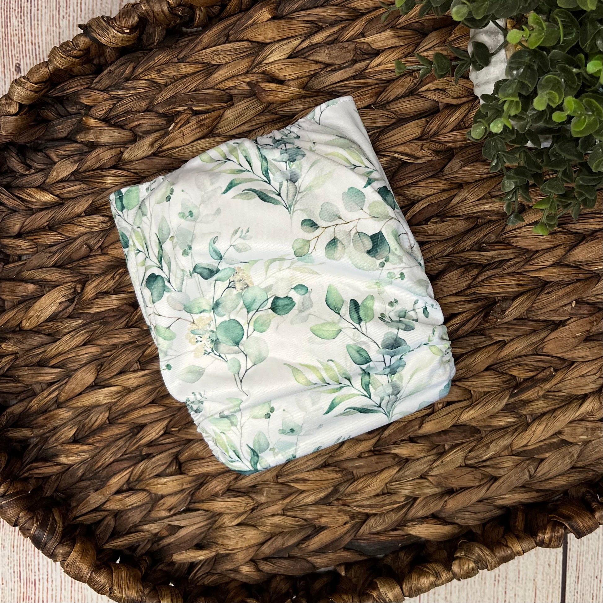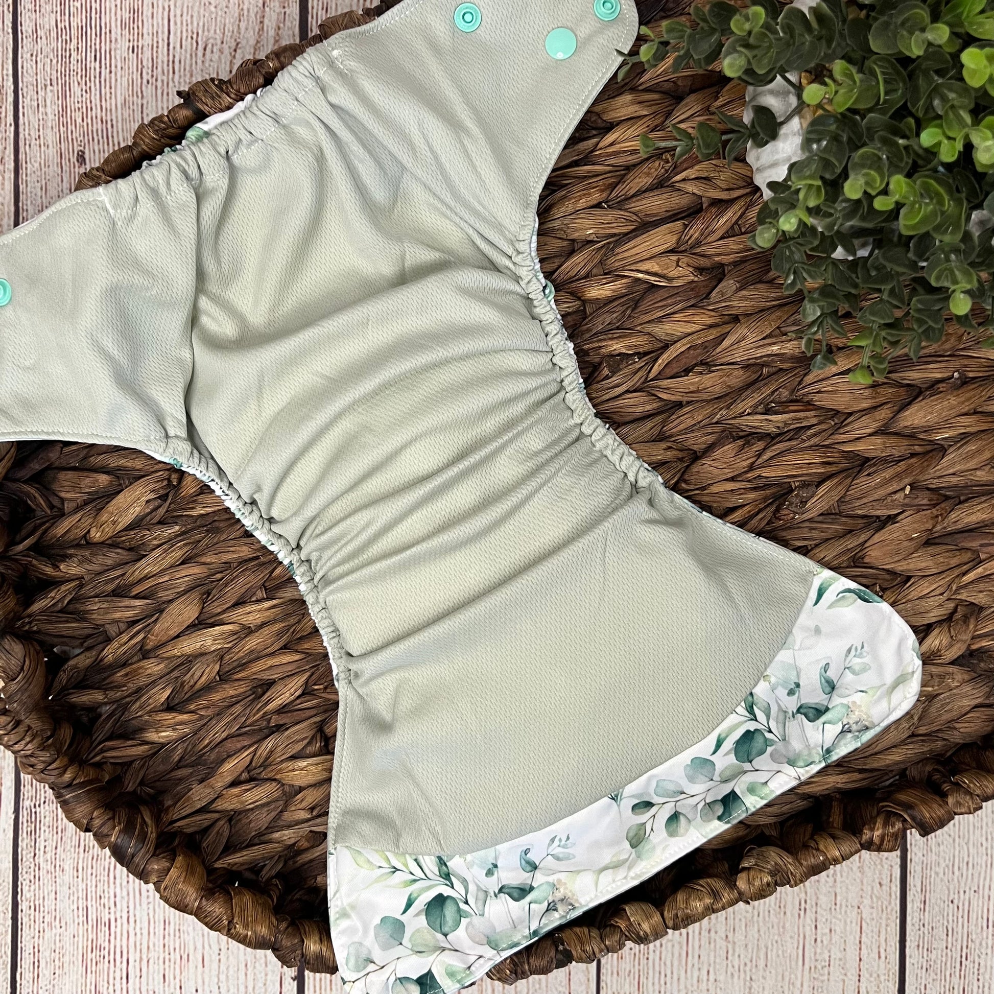 - Grey AWJ inner layer, PUL curved tummy panel to help prevent leaks, gentle back and leg elastics, and a pocket opening.
