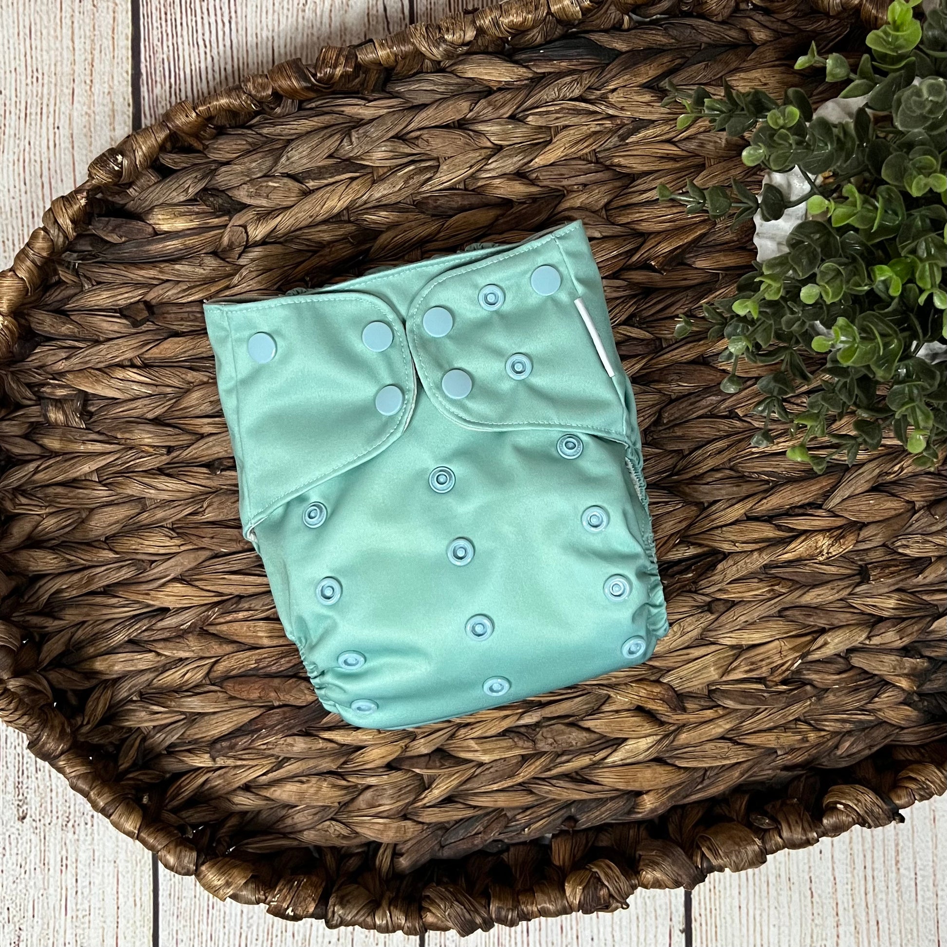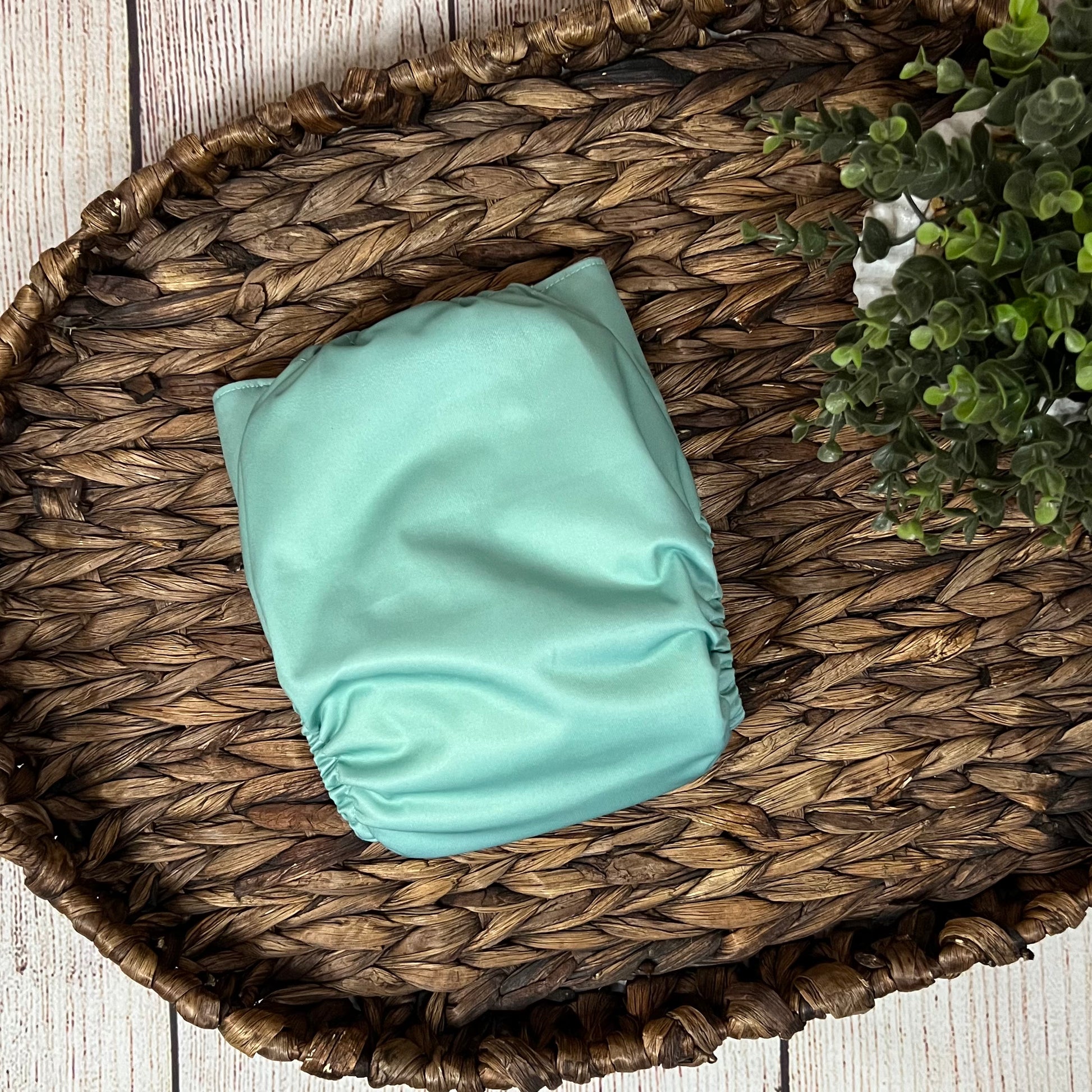 - Grey AWJ inner layer, PUL curved tummy panel to help prevent leaks, gentle back and leg elastics, and a pocket opening.