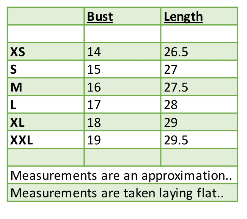 - See measurements in chart photo. Please remember the measurements are an appropriation and are taken laying flat